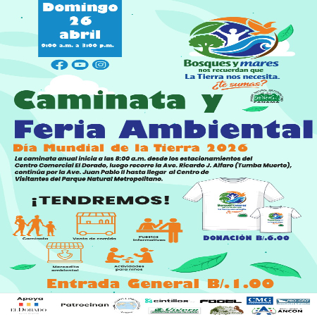 ✨ ¡Celebra con nosotros el Día Mundial de la Tierra! ✨🌍 Lema: Cuidemos la Tierra : Nuestro hogar, nuestra responsabilidad ¡Apoya el cambio! 🌎 Únete a la Caminata y Feria Ambiental este domingo 27 de abril de 2025 y ayúdanos a proteger nuestro hogar. 💚♻️ 🚶♂️ Caminata: 📍 Salida: Estacionamientos de Centro Comercial El Dorado 🕗 Hora: 8:00 a.m. 📍 Ruta: Ave. Ricardo J. Alfaro → Ave. Juan Pablo II → Centro de Visitantes del PNM Escanea el código QR e Inscríbete a la caminata o utiliza nuestro link de inscripción: https://arcg.is/1zuz9b3 🎉 Feria Ambiental: 🕘 9:00 a.m. - 3:00 p.m. 🎟 Entrada General: B/.1.00 💚 ¡Apoya el cambio! Adquiere productos...